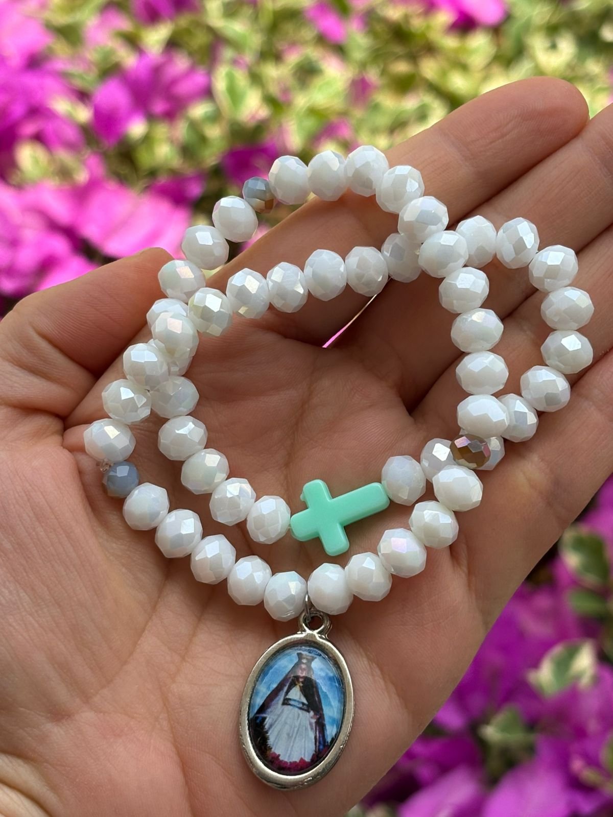 Elaborado en murano color blanco, con pasantes en murano celeste , Cruz en acrílico color aguamarina y medallita de la Virgen de la Salud del Páramo Santander de 3 cm