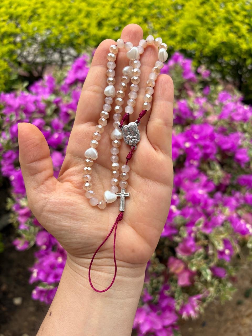 Elaborado en murano color rosado claro, en las gloria corazón blanco , crucero de la sagrada familia y cruz en zamak italiano