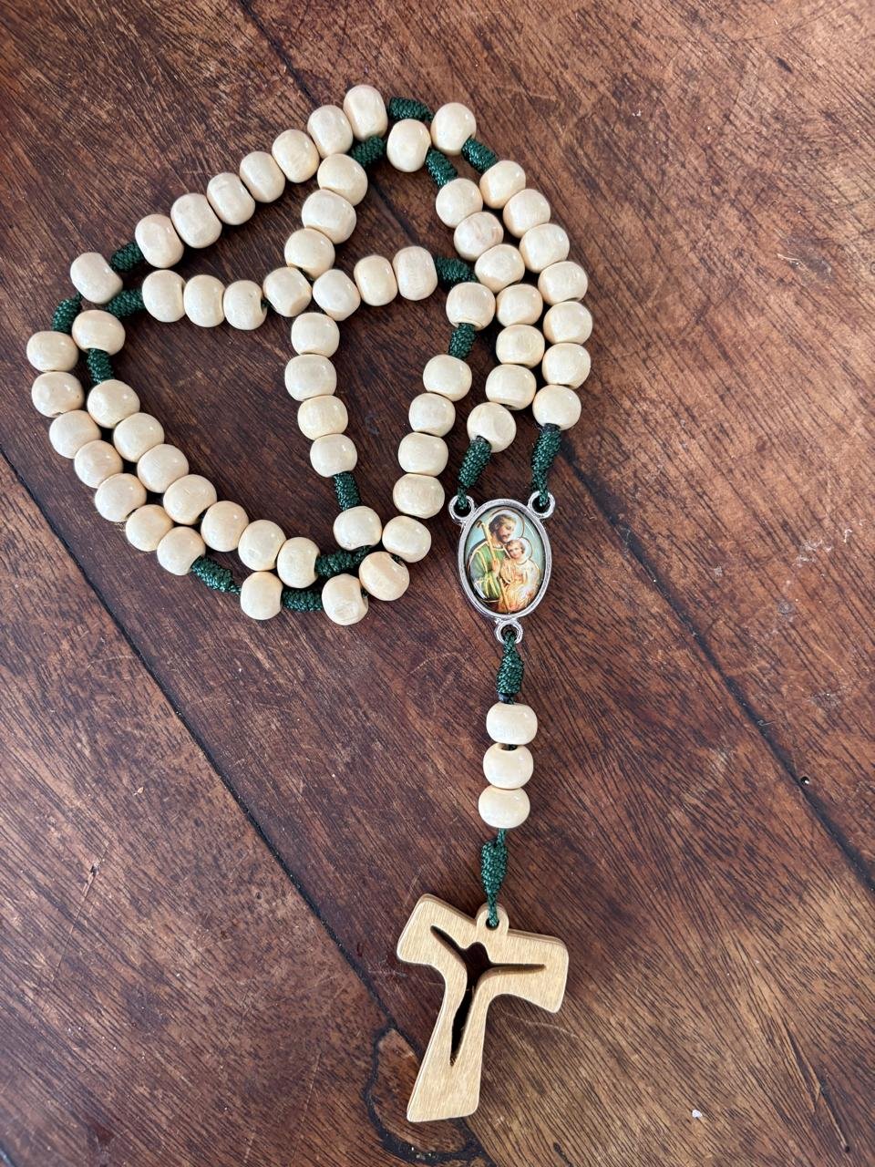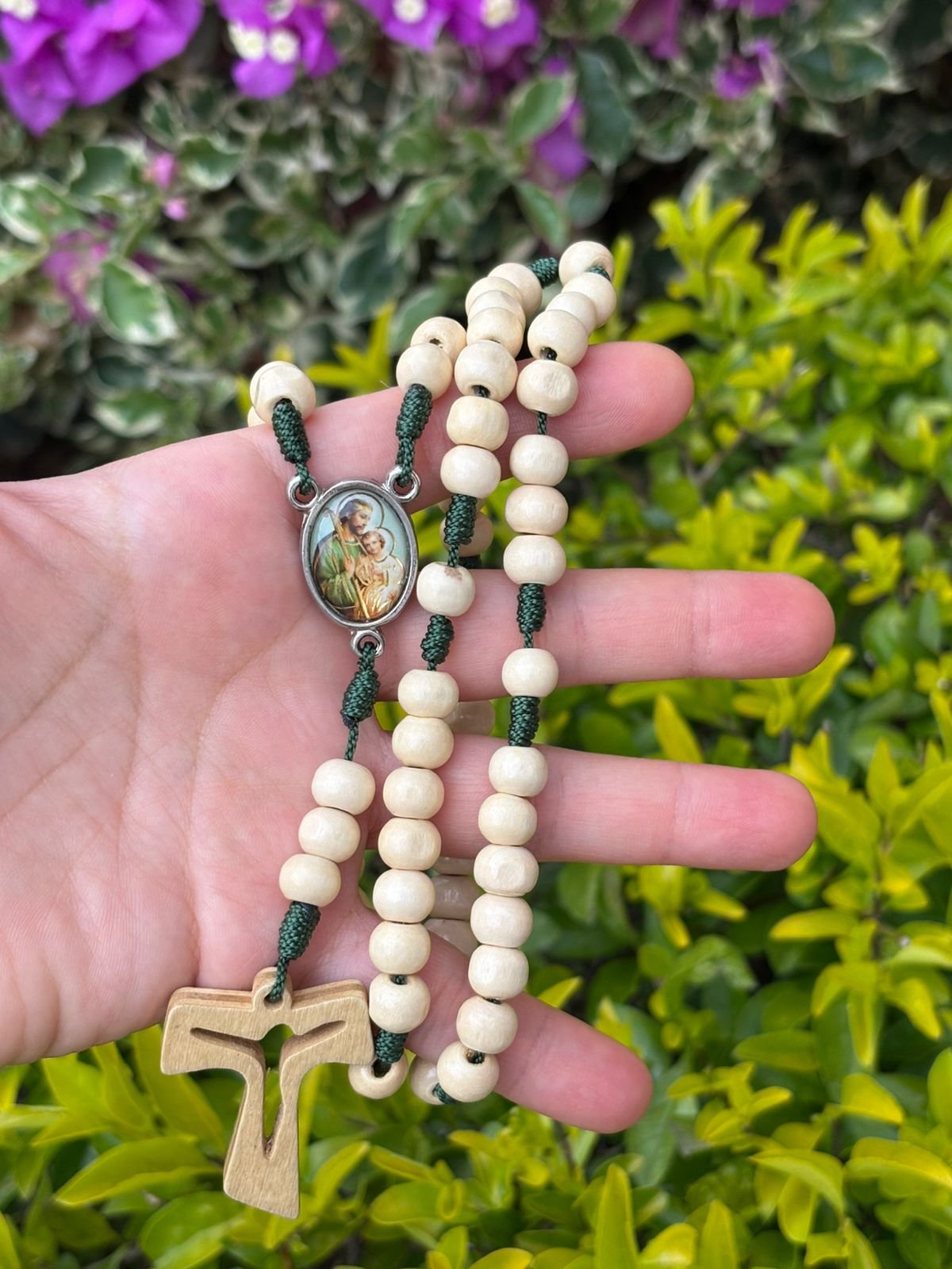Elaborado en madera clara, hilo color verde olivo, crucero por un lado San José por el otro lado Virgen desatanudos, cruz en madera